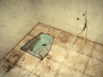 Muhamed Aly Bedouin village, Dahab, Sinai Peninsula, Egypt. Another great floor-mounted squatter, this one set into a tile floor. A great hose/sprayer unit here! This is excellent by Egyptian standards, but then again it’s in Sinai, not along the Nile. By the way, Dahab is on the beach, and that’s sand you see there!